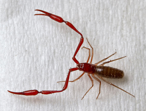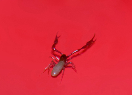 Central Oregon had a new species of pseudoscorpion collected in 1938 by J. Valentine at the Redmond Caves. Joseph Chamberlin identified and named it Parobisium charlotteae after his wife. Charlotteae are now thought to be extirpated from the Redmond Caves. In 2013, a group from the Oregon High Desert Grotto collected a pseudoscorpion in an unrelated cave of Central Oregon that appears to be charlotteae. If so, this would be an exciting rediscovery. Pictured here is the specimen collected in 2013.