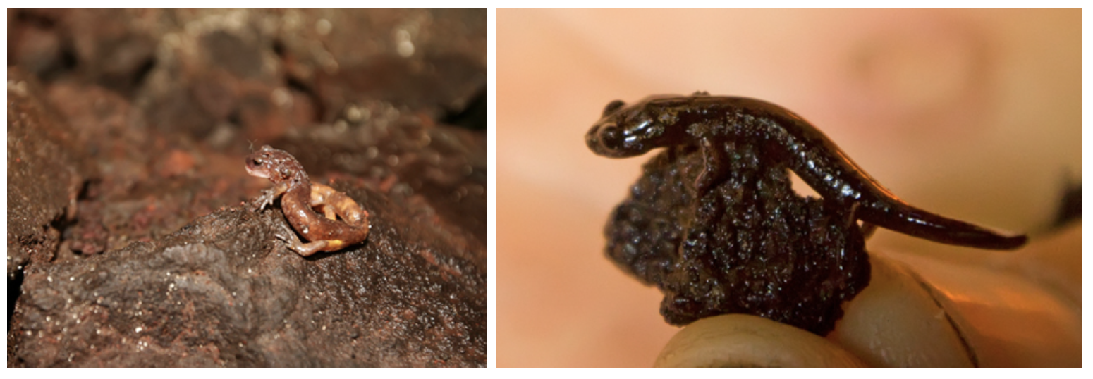 In Central Oregon, salamanders are very rare because the climate is too arid. The closer you get to the Cascade mountains the better your chances are of spotting a salamander in a cave. Salamanders are typically found in Central Oregon caves when they’ve fallen into an inescapable entrance. In Western Oregon, salamanders are more likely to be trogloxenes, moving in and out of caves, and sometimes travel further into a cave if it’s moist and food remains plentiful.