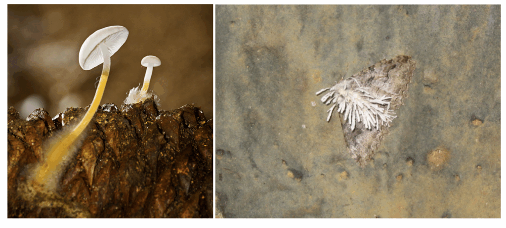 Mycelium is the organism that mushrooms grow from (top left photo). It appears as a root-like membrane that grows in the soil, but can be observed on the surface of a dirt floor in caves. Mycelium is identified by its dendritic characteristics. The number of mycelium species is too great to summarize in any detail here, but a few caves in Central Oregon grow fruiting bodies, the mushroom, at different times of the year. Mushrooms have been observed on rotting logs in cave entrances, dirt floors, or even on pinecones that have been carried in by woodrats. Because mycellium doesn’t need sunlight to grow, it can carry on indefinitely within a cave, as long as nutrients remain. However, mycelium is not noted to be cave adapted.