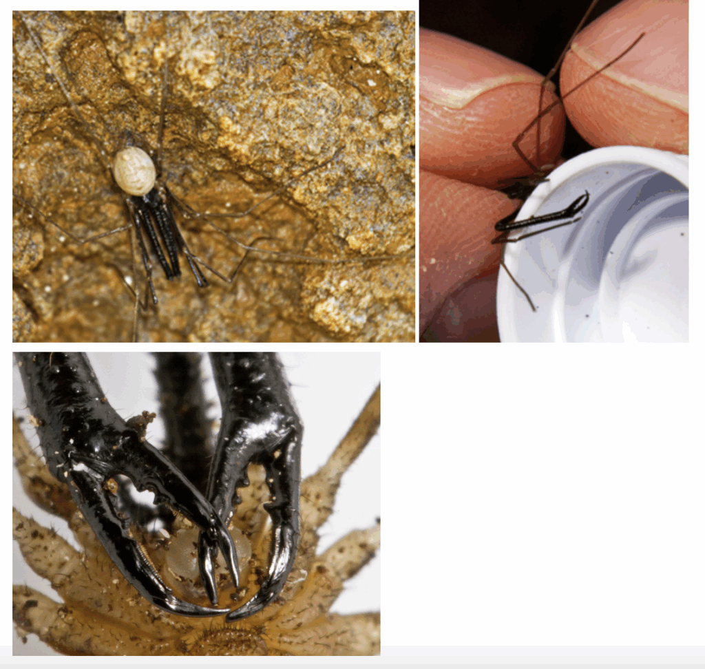 This species of harvestman has been found in 18 different caves of Central Oregon and likely exists in many more. It was observed in the past at several caves, including Lava River Cave prior to 1982, and again in 2008. Oregon High Desert Grotto member Neil Marchington was the first to study the harvestman and submitted it to Dr. William Shear of Hampton-Syndney College for identification. Shear classified it a new species endemic to Oregon. Marchington has observed the harvestman feeding on cave-adapted millipedes (see above). It utilizes its long pincers (in black) to grab prey. The picture on the left was taken in Pucker River Cave in November of 2012.