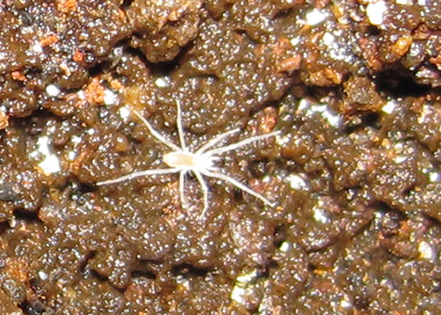 Mite species, possibly Flabellorhagidia pecki, of the Rhagidiidae family. The length is between 1 and 2 millimeters. Its legs have tinyl bristles. The most important feature of this specimen is the white color. This is a good indicator, though not definitive, of cave adaptation. The specimen on the right was observed in Talking Scroll Cave of Central Oregon in 2012. Special thanks to Francis G. Howarth for the identification. First photo was taken courtesy of Andrew Quick.